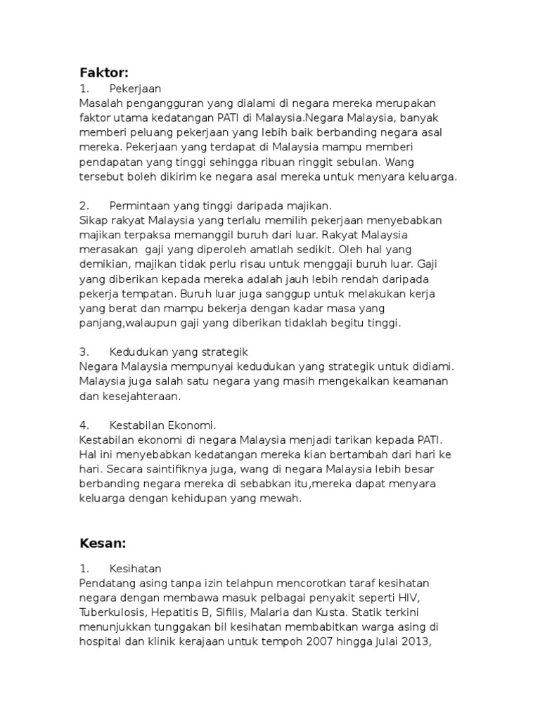 Hubungan mereka secara seksual dengan pelacur tempatan akan mempercepat jangkitan aids. Di samping itu, kemasukan pekerja asing ini juga turut memberi kesan terhadap ekonomi negara kita. Antara inisiatif yang diambil untuk tujuan itu ialah ops benteng bagi menangani kehadiran pati yang. Download faktor kedatangan pendatang asing tanpa izin (final). Bantu jawab dan dapatkan poin.